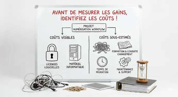 Avant de mesurer les gains, il faut d'abord identifier clairement les coûts. Un projet de numérisation de workflow implique plusieurs postes de dépenses qu'on a tendance à sous-estimer.